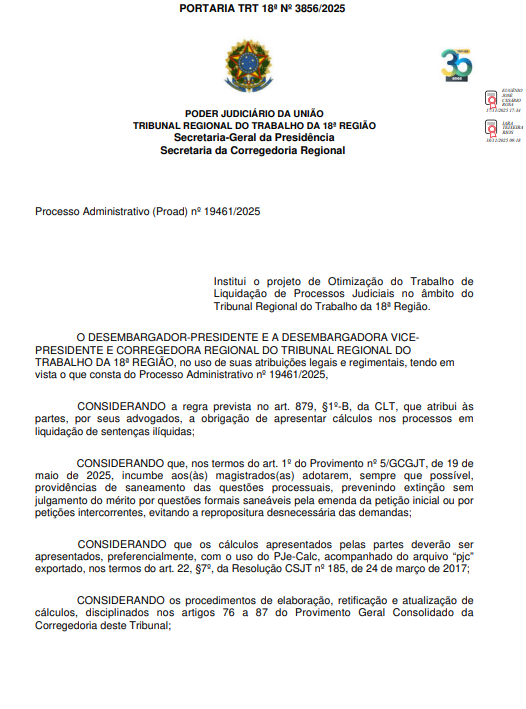 O Tribunal Regional do Trabalho da 18ª Região publicou a Portaria nº 3.856/2025, instituindo um novo modelo de liquidação que fortalece o papel das partes na elaboração dos cálculos judiciais por meio do PJe-Calc. A medida marca uma mudança estrutural no fluxo de liquidação e execução e, após atuação da AGATRA e da OAB-GO, o dispositivo que exige cálculos líquidos na petição inicial somente passará a valer a partir de 3 de abril de 2026, garantindo período adequado de adaptação à advocacia trabalhista.